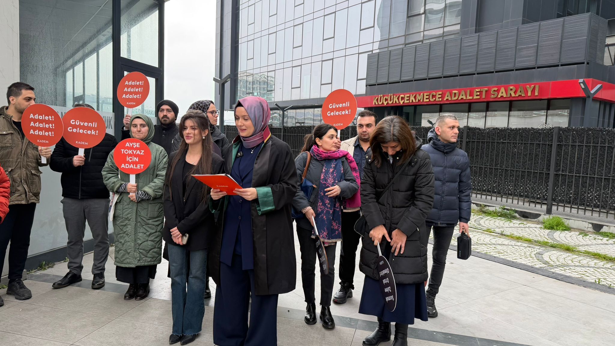 Adliye önünde toplanan kalabalık adına basın açıklamasını Kadın ve Demokrasi Vakfı (KADEM) avukatı Sinem Ermiş okudu. Ermiş, davanın sonuna kadar takipçisi olacaklarını belirterek şu ifadeleri kullandı: