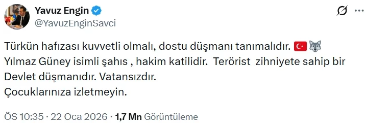Cumhuriyet Savcısı Yavuz Engin, Yılmaz Güney aleyhinde bir paylaşım yapmış ve "Çocuklarınıza izletmeyin" demişti. İşte o paylaşım;