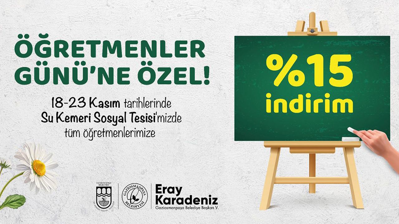 18-23 Kasım tarihleri arasında geçerli olacak indirim ile Gaziosmanpaşa Belediyesi öğretmenlerin emeklerine teşekkür etmeyi amaçlıyor. Kampanyadan yararlanmak isteyen öğretmenlerin, belirtilen tarihlere göre tesisten rezervasyon yaptırmaları yeterli olacak.