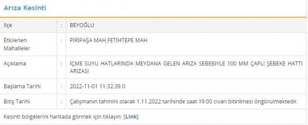İSKİ tarafından yayımlanan 1 Kasım arıza-kesinti listesiyle birlikte, İstanbul'un 6 ilçesinde su kesintisi yaşanacağı duyurulmuştu. Daha önceden 9 saat sürmesi planlanan ve saat 09.48'de başlayan su kesintisinin birkaç saat içinde sona ermesi bekleniyor.
