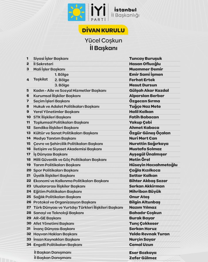 Delegelerin güçlü desteğiyle yeniden göreve gelen Coşkun, kongrenin üzerinden bir aydan daha uzun bir süre geçmesinin ardından İYİ Parti İstanbul İl Başkanlık Divanı’nı açıkladı. Coşkun’un yeni dönemde 23 kişilik divanı 36 kişiye çıkardığı, A takımının ise büyük ölçüde yenilendiği görüldü. Açıklanan listede divan üyelerinin yalnızca 9’unun kadın olması dikkat çekti.