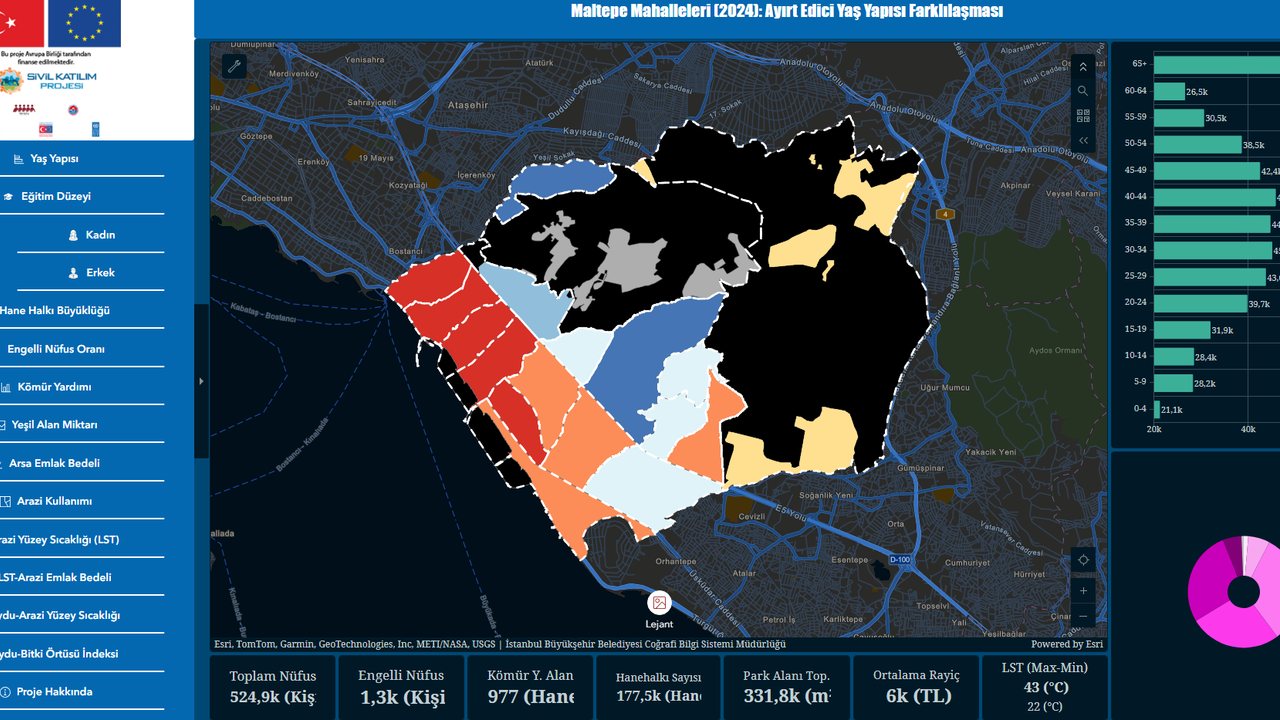 Dijital harita; Maltepe’nin sosyal, ekonomik ve çevresel yapısını birlikte ele alan çok boyutlu veriler sunuyor. Harita üzerinden: